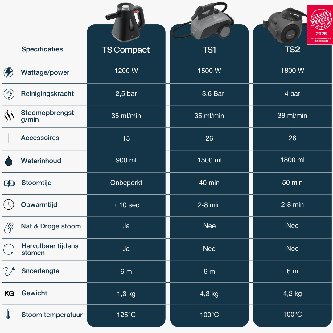 • Onze stoomreinigers zijn enorm krachtig. Minimaal 1500W en 4 bar waardoor je alle soorten vuil kunt stomen